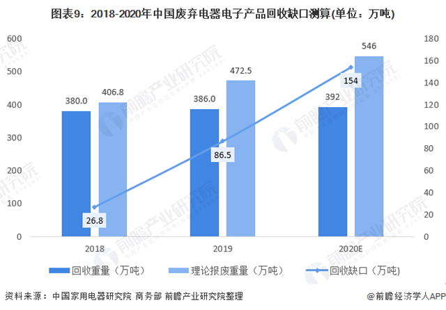 綜合2018-2019年中國家用電器研究院公布的廢棄電器電子產(chǎn)品修正的理論報廢重量及商務(wù)部所發(fā)布的廢棄電器電子產(chǎn)品回收重量可發(fā)現(xiàn),2018-2019年,我國首批廢棄電器電子目錄產(chǎn)品理論報廢重量高于回收重量,回收缺口上升。2019年,我國首批廢棄電器電子目錄產(chǎn)品回收缺口達86.5萬噸,回收量占理論報廢量比重為82%。根據(jù)變化趨勢,2020年,回收缺口約達154萬噸。