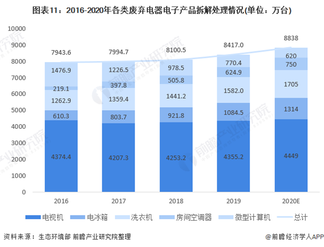 2016-2019年,電視機拆解量變化較為平穩(wěn),電冰箱、洗衣機、微型計算機拆解處理量分別以21%、8%、-20%的增長率復(fù)合增長,房間空調(diào)器增長率逐年下降,2020年約降至20%。依此增長率進行測算,2020年,電視機、電冰箱、洗衣機、房間空調(diào)器、微型計算機拆解量約分別為4449萬臺、1314萬臺、1705萬臺、750萬臺、620萬臺,總計約達8838萬臺。
