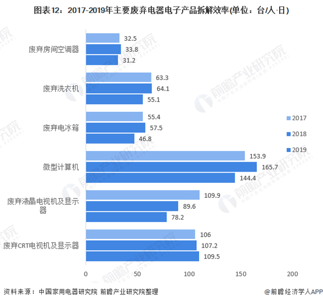 從拆解效率上看,2017-2019年,我國廢棄液晶電視機產(chǎn)品拆解效率逐年下降,而其他廢棄電器電子產(chǎn)品拆解效率變化并不明顯。