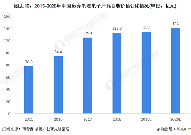 從回收價值看,根據(jù)商務(wù)部數(shù)據(jù),2015-2018年中國廢棄電器電子產(chǎn)品回收價值整體呈增長趨勢,2018年達133億元。根據(jù)我國廢棄電器電子產(chǎn)品回收數(shù)量與回收重量比率,2019年,我國廢棄電器電子產(chǎn)品回收價值約達135億元,2020年約達141億元。