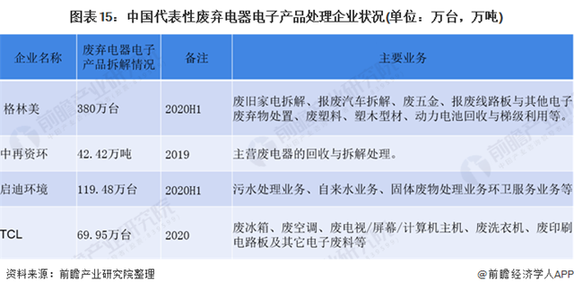具體來看,2020年上半年,格林美廢棄電器電子產(chǎn)品拆解量達380萬臺,啟迪環(huán)境廢棄電器電子產(chǎn)品拆解量達119.48萬臺,TCL拆解量達69.95萬臺,中再資環(huán)拆解處理量達42.42萬噸。