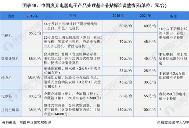 2021年3月,《關(guān)于調(diào)整廢棄電器電子產(chǎn)品處理基金補貼標準的通知》發(fā)布,對廢棄電器電子產(chǎn)品處理基金補貼標準予以調(diào)整。其中,電視機補貼范圍為40-45元/臺,微型計算機45元/臺,洗衣機25-30元/臺,電冰箱55元/臺,房間空調(diào)器100元/臺??傮w來看,與2015年基金補貼標準相比,補貼標準下降。