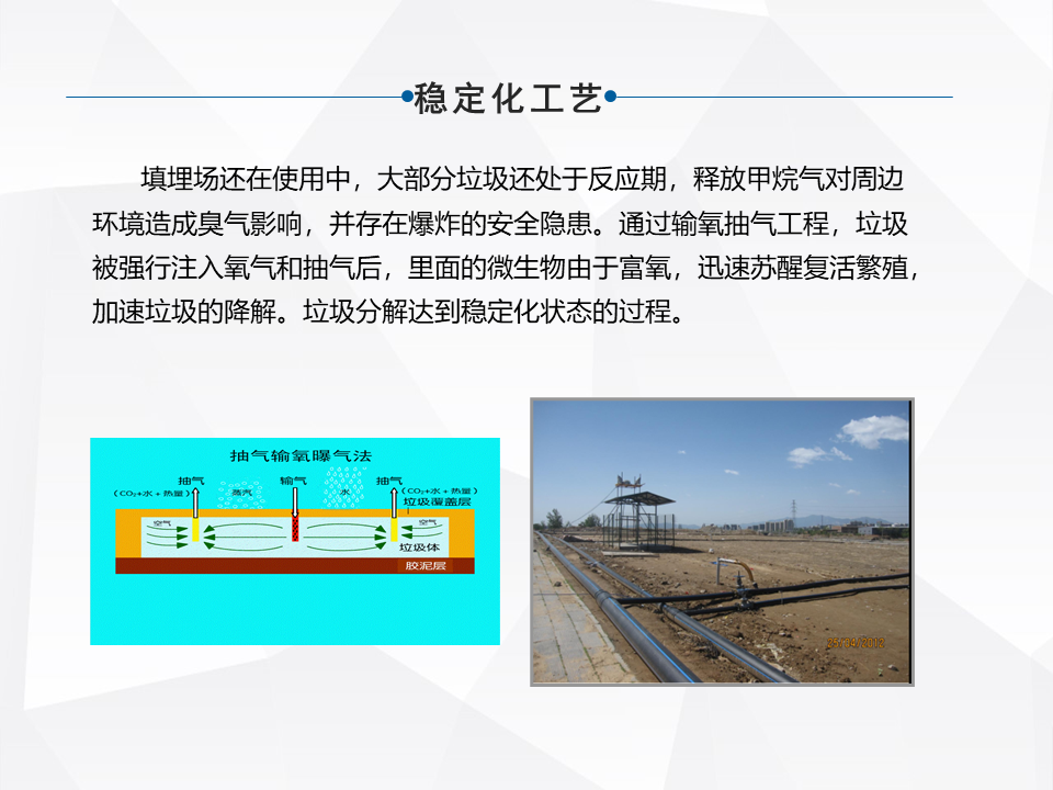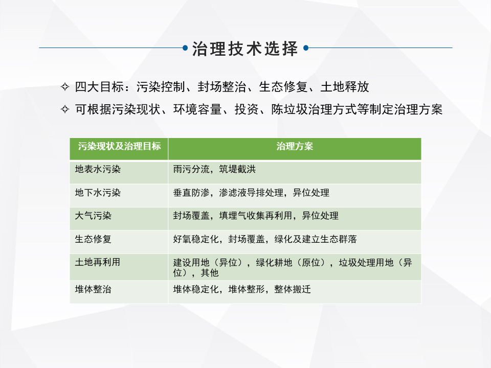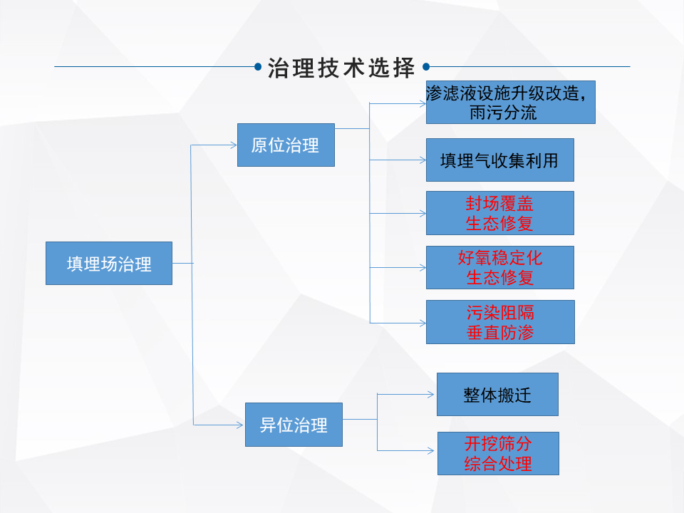 處理的技術(shù)涵蓋的面,整個行業(yè)涵蓋的面還是比較多的,大的來分,有原位的治理和異位的治理。原味的治理,像衛(wèi)生填埋場和簡易填埋場需要做一些現(xiàn)有的配套設(shè)施的升級,雨污分流,怎么樣能去有效的減少持續(xù)的像滲濾液產(chǎn)生。填埋氣的收集利用,還有有的是直接封廠覆蓋,做生態(tài)修復(fù),還有做一個加速的酶化以后,再做生態(tài)修復(fù)。還有早期的簡易填埋,甚至沒有做防滲的,在現(xiàn)有不具備整體搬遷的條件下,去做一些污染阻隔。
