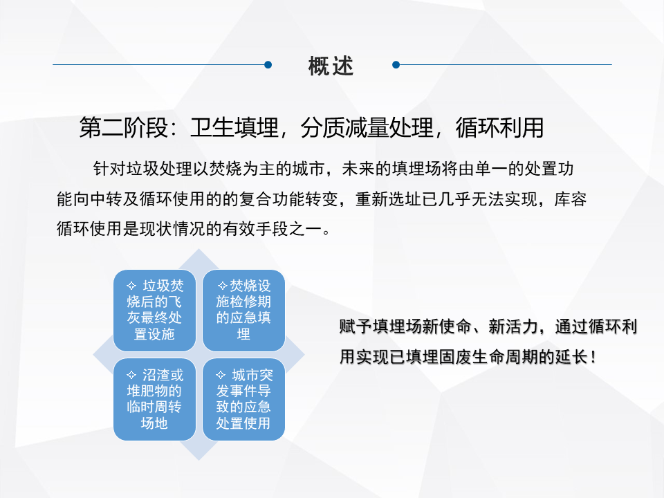 第二個階段,“十二五”、“十三五”主要針對非正規(guī)填埋場的治理,到“十四五”或者未來的十年,目前已經(jīng)開始關(guān)注新的填埋場由單一的處理功能向中轉(zhuǎn)和循環(huán)使用的復(fù)合功能區(qū)轉(zhuǎn)變,很多都是對填埋場的場地有再利用的需求,或者對庫容有循環(huán)利用的需求。近幾年,特別是北上廣深這些土地比較緊缺的,人口比較密集的城市,最早開始關(guān)注到這個行業(yè)。