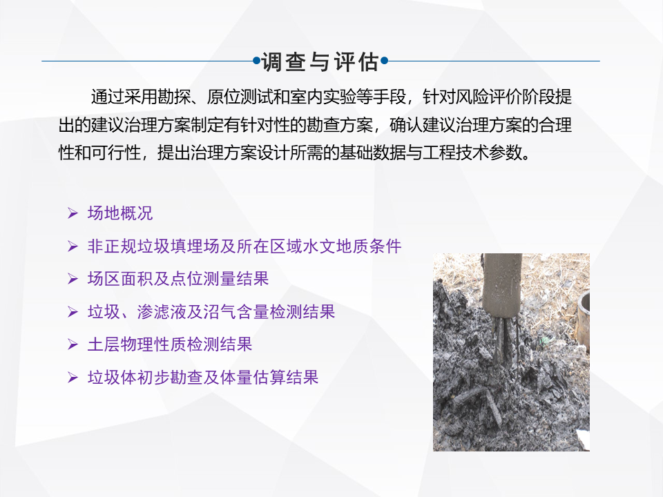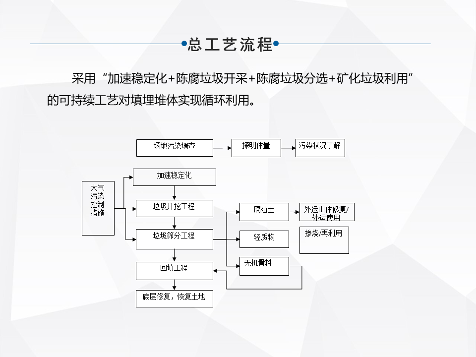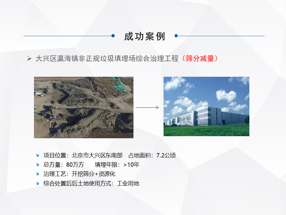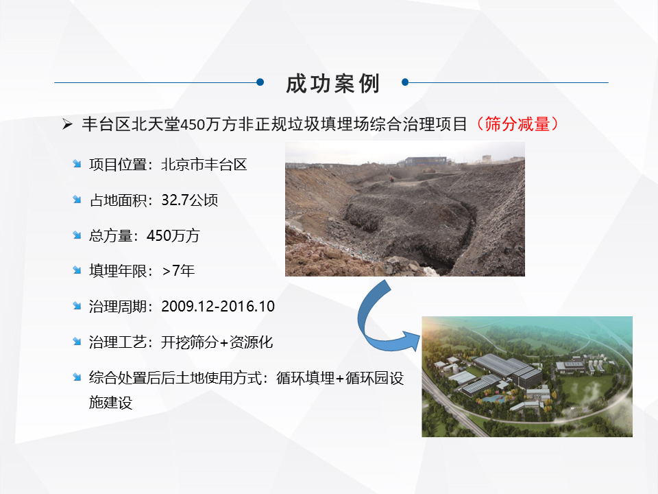 另外一種就是做一個異位的治理,這是一些小規(guī)模的,城市規(guī)劃了大型的填埋場,對一些小型的就做整體的搬遷。特別前幾年的時(shí)候,像河北很多地區(qū)整體的做坑塘垃圾的收集,就是把一些小散亂的,集中的匯到一個地方。還有一塊就是做綜合的處理,我們最早因?yàn)楣疽彩亲龇诌x技術(shù)出來的,最早我們主流是做綜合處理這塊比較多一些。