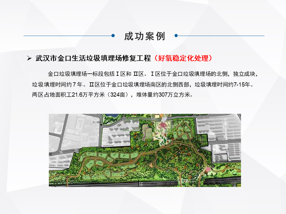 武漢的金口做了加速穩(wěn)定化,滲濾液的集中處理以后,當(dāng)時(shí)是做成了武漢那一屆園博園的項(xiàng)目。這個是武漢北洋橋,是簡易填埋場的生態(tài)修復(fù),這個項(xiàng)目最早12年我們?nèi)サ臅r(shí)候,它離武漢高鐵站特別近,周圍樓盤比較多,環(huán)境敏感度比較高。最早政府是要把它徹底清理的,最早想整體開挖和綜合處理,后來沒有采用,有幾個必要的條件,當(dāng)時(shí)它的體量將近四百多萬方,治理的周圍不能特別長。短期之內(nèi)真的是開發(fā)出來,分選完了哪些物料,在短時(shí)間內(nèi)怎么有效的再利用和實(shí)現(xiàn)減量消納,是很難實(shí)施的。最后他先采用了原位修復(fù)的方式,先讓整體的環(huán)境得到了一個比較大程度的改善。