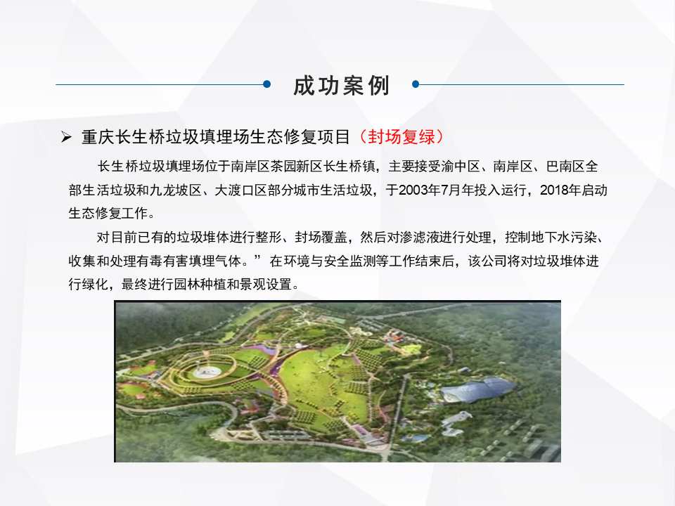 這是我們最早做的一個,最早的正規(guī)填埋場,剛才我提到的那兩個都是受控的,政府統(tǒng)一管理的衛(wèi)生填埋場,集中填埋的。最早我們做的這個,早期沒在政府監(jiān)管范圍內(nèi)的建筑垃圾、生活垃圾混填的那種。這個也是那一批做的,是用作工業(yè)用地。政策上,“十二五”、“十三五”部里面也是首次提出來存量垃圾治理,每個行業(yè)它的需求也是隨著發(fā)展,在“十二五”之前并不是沒有問題,也是先解決眼前的問題,轉(zhuǎn)過頭來,再有能力的時(shí)候,就把當(dāng)時(shí)的一些問題解決。