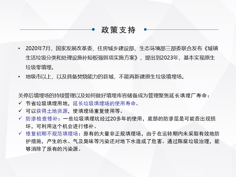 簡單快速地分享一下,老舊填埋場綜合整治,或者現(xiàn)在提出來叫存量垃圾處理,在咱們整個行業(yè)里面屬于一個角落。