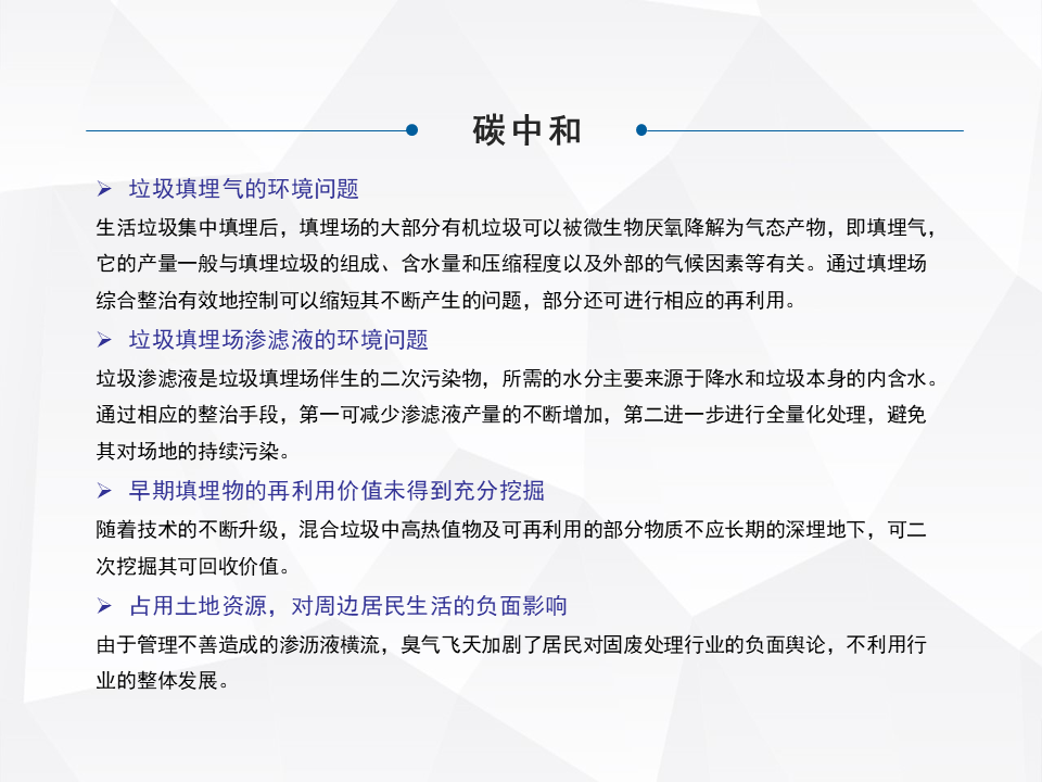 說到老舊填埋場的治理,前期的時(shí)候從剛才提到的,從“十二五”、“十三五”,最早是北京做,然后延伸到部里推廣全國去做,最開始主要是因?yàn)橛行┰缙诘奶盥駡鎏盥癫灰?guī)范,主要還是著眼于它對環(huán)境的負(fù)面影響,能及時(shí)消除污染。但是從去年開始,隨著國家固廢處理產(chǎn)業(yè)結(jié)構(gòu)的調(diào)整,垃圾填埋在整個固廢處理里面的定位也在不斷的變化。未來雖然是以焚燒為主,但是每個城市還是要有填埋場的,是要作為一個應(yīng)急處理的設(shè)施。甚至未來的定位跟現(xiàn)在在收運(yùn)環(huán)節(jié)的垃圾中轉(zhuǎn)站一樣,在空間和時(shí)間上給整個城市的垃圾處置,在協(xié)調(diào)過程中能提供一個時(shí)間和空間的中轉(zhuǎn)。