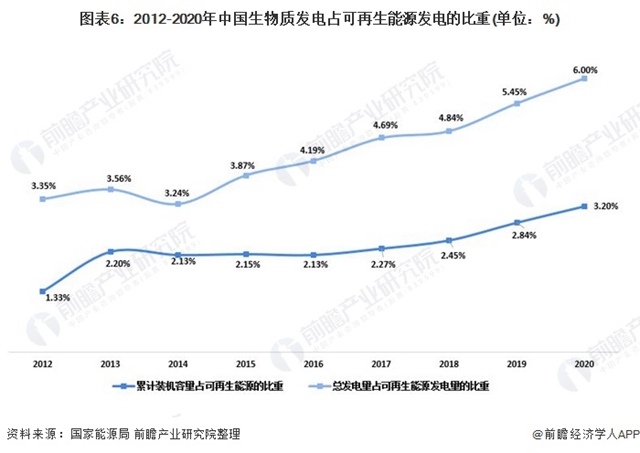 隨著生物質(zhì)發(fā)電快速發(fā)展,生物質(zhì)發(fā)電在我國可再生能源發(fā)電中的比重呈逐年穩(wěn)步上升態(tài)勢。截至2020年底,我國生物質(zhì)發(fā)電累計裝機容量占可再生能源發(fā)電裝機容量的3.2%;總發(fā)電量占比上升至6.0%。生物質(zhì)能發(fā)電的地位不斷上升,反映生物質(zhì)能發(fā)電正逐漸成為我國可再生能源利用中的新生力量。