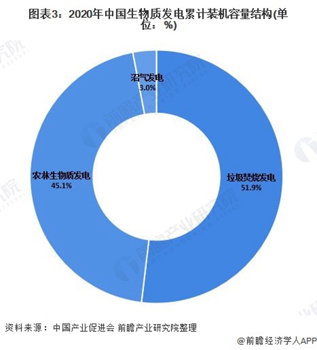 生物質(zhì)發(fā)電主要包括農(nóng)林生物質(zhì)發(fā)電、垃圾焚燒發(fā)電和沼氣發(fā)電。2020在,在我國生物質(zhì)發(fā)電結(jié)構(gòu)中,垃圾焚燒發(fā)電累計裝機容量占比最大,達到51.9%;其次是農(nóng)林生物質(zhì)發(fā)電,累計裝機容量占比為45.1%;沼氣發(fā)展累計裝機容量占比僅為3.0%。