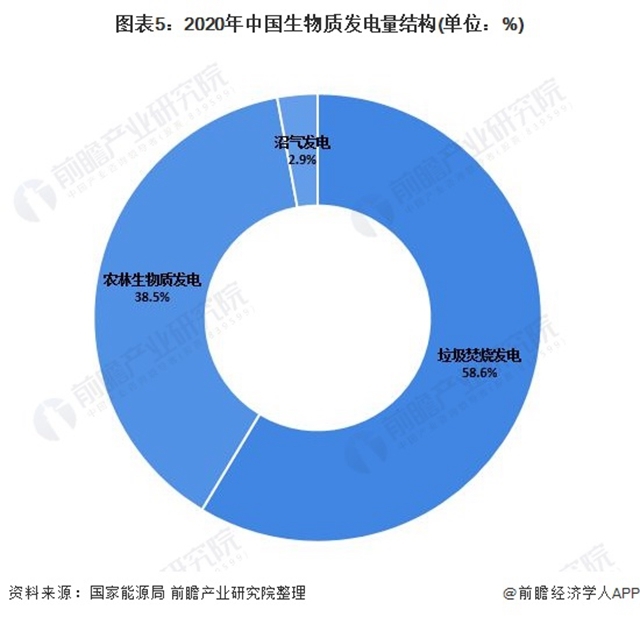從發(fā)電量結(jié)構(gòu)來看,垃圾焚燒發(fā)電量最大,2020年中國垃圾焚燒發(fā)電量為778億千瓦時,占比為58.6%;農(nóng)林生物質(zhì)發(fā)電量為510億千瓦時,占比為38.5%;2020年沼氣發(fā)電量為37.8億千瓦時,占比為2.9%。