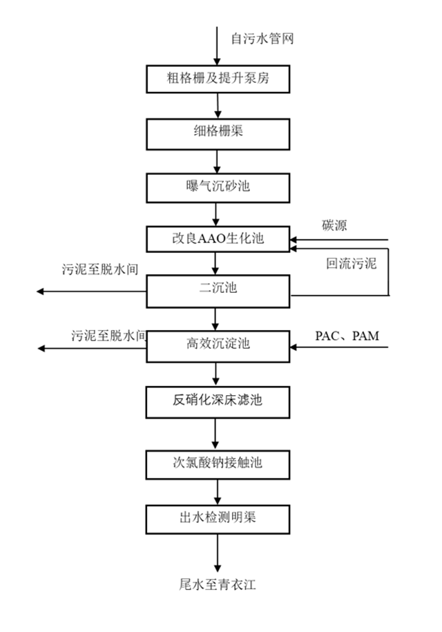 (1)外部市政管網(wǎng)來(lái)水+采用粗格柵+提升泵站+細(xì)格柵+曝氣沉砂池+A2/O+二沉池+高效沉淀池+反硝化深床濾池+接觸消毒池工藝。