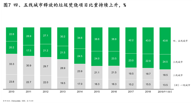 二是四、五線城市釋放的垃圾焚燒項(xiàng)目比例越來越高。目前,(新)一線、二線、三線城市的項(xiàng)目增速都在放緩甚至下降,未來5~10年最大的增長將是四、五線城市。例如,2019年四、五線城市的垃圾焚燒項(xiàng)目占比高達(dá)43.6%,同期的新一、二線城市則分別只占到13.5%和18.5%(見圖7)。