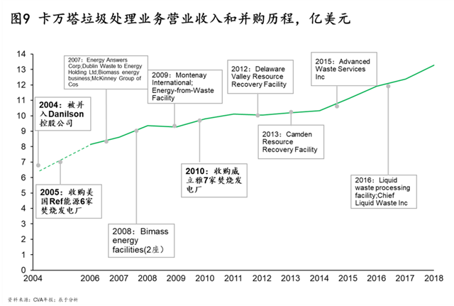 發(fā)達(dá)國家的成熟市場經(jīng)驗(yàn)表明,環(huán)保政策和行業(yè)標(biāo)準(zhǔn)的趨嚴(yán)會推動行業(yè)整合。例如在美國,自20世紀(jì)90年代以來,一系列針對垃圾焚燒行業(yè)的細(xì)化標(biāo)準(zhǔn)不斷出臺,大量中小型公司受到嚴(yán)峻考驗(yàn),擁有技術(shù)優(yōu)勢的卡萬塔通過并購持續(xù)提高市場份額,現(xiàn)已成為美國最大的垃圾焚燒發(fā)電投資商,占據(jù)高達(dá)67%的市場份額(見圖9)。