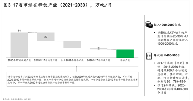 截至當(dāng)前,已有17個(gè)省市發(fā)布了垃圾焚燒中長(zhǎng)期發(fā)展規(guī)劃,根據(jù)這些省市到2030年的相關(guān)產(chǎn)能規(guī)劃,未來10年仍將有20~30萬噸/日的新增產(chǎn)能,釋放項(xiàng)目400~500個(gè),投資規(guī)模1000~2000億元(見圖3)。而如果放眼全國(guó),這三個(gè)數(shù)字只會(huì)更大。這一體量不容小覷,相當(dāng)于當(dāng)前行業(yè)排名第2-9位企業(yè)的在手產(chǎn)能之和,釋放的項(xiàng)目數(shù)量則相當(dāng)于過去3年的全部開標(biāo)項(xiàng)目數(shù)量。