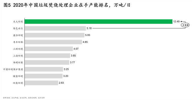 當(dāng)前,我國(guó)垃圾焚燒處理市場(chǎng)呈現(xiàn)“一枝獨(dú)秀”的競(jìng)爭(zhēng)格局:處于領(lǐng)先地位的光大環(huán)境,連續(xù)多年排名第一,截至2020年底,在手產(chǎn)能[2]12.49萬噸/日,是排在第二位的綠色動(dòng)力5.18萬噸/日的2.4倍,優(yōu)勢(shì)十分明顯,而排在第2-9位的企業(yè),在手產(chǎn)能大多在3-5萬噸/日左右,實(shí)力相當(dāng),差距不大(見圖5)。