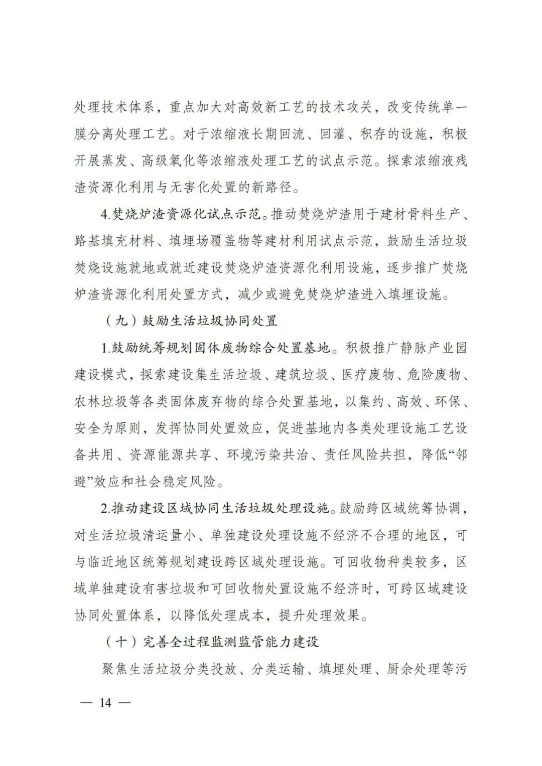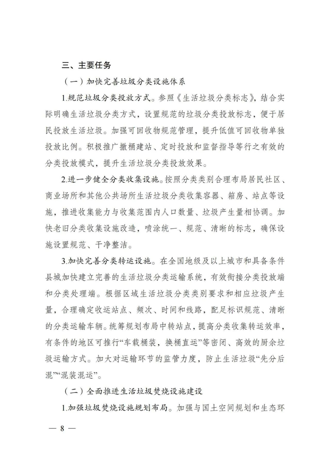 到2025年底,直轄市、省會城市和計劃單列市等46個重點城市生活垃圾分類和處理能力進一步提升;地級城市因地制宜基本建成生活垃圾分類和處理系統(tǒng);京津冀及周邊、長三角、粵港澳大灣區(qū)、長江經(jīng)濟帶、黃河流域、生態(tài)文明試驗區(qū)具備條件的縣城基本建成生活垃圾分類和處理系統(tǒng);鼓勵其他地區(qū)積極提升垃圾分類和處理設施覆蓋水平。支持建制鎮(zhèn)加快補齊生活垃圾收集、轉運、無害化處理設施短板。