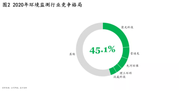 過去幾年內(nèi),國內(nèi)設(shè)備企業(yè)強(qiáng)勢擴(kuò)張,市場份額持續(xù)提升。外資企業(yè)雖有技術(shù)優(yōu)勢,但由于我國對相關(guān)設(shè)備國產(chǎn)化的支持,加之國內(nèi)企業(yè)自身的技術(shù)進(jìn)步,優(yōu)勢不斷下滑??梢钥吹剑瑸榧涌飙h(huán)境監(jiān)測設(shè)備國產(chǎn)化步伐,國家出臺多項(xiàng)政策,如《空氣質(zhì)量新標(biāo)準(zhǔn)第二階段監(jiān)測實(shí)施方案》、《生態(tài)環(huán)境監(jiān)測網(wǎng)絡(luò)建設(shè)方案》等,鼓勵(lì)國內(nèi)科研部門和相關(guān)企業(yè)研發(fā)具有自主知識產(chǎn)權(quán)的環(huán)境監(jiān)測儀器設(shè)備,規(guī)定政府在滿足需求的條件下優(yōu)先使用國產(chǎn)設(shè)備。第三方運(yùn)維企業(yè)以小規(guī)模居多,受數(shù)據(jù)造假、運(yùn)維不規(guī)范、信任危機(jī)等一系列問題影響,部分被淘汰出局。截至2020年,我國環(huán)境監(jiān)測CR5為45.1%(如圖2),行業(yè)集中度較高。
