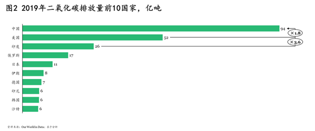 我國于2007年超過美國,成為二氧化碳排放第一大國,2019年二氧化碳排放量94億噸,遠高于同期美國的52億噸和印度的26億噸(如圖2)。