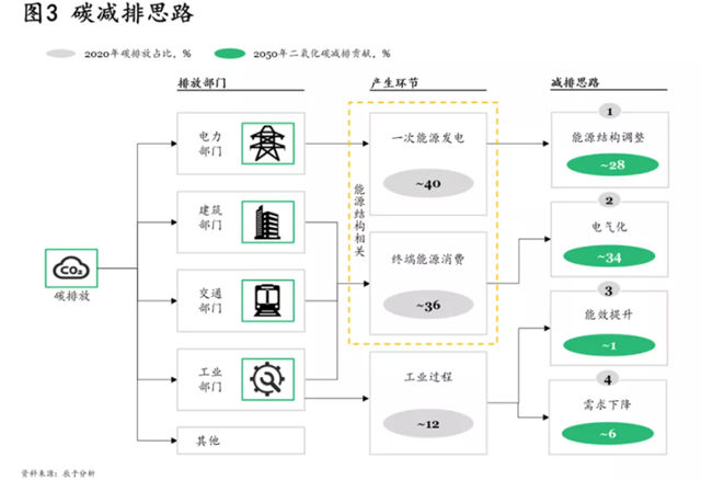 二是終端非電部門電氣化。擁有清潔電源后,將終端非電力部門所使用的能源從化石燃料轉向電力即可實現(xiàn)非電部門脫碳,預計2050年工業(yè)、建筑、交通部門電氣化水平分別為58%、64%、25%。