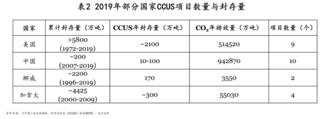 當前,我國每年CCUS封存量僅為10——100萬噸,遠低于美國每年的2100萬噸。截至2019年底,我國二氧化碳累積封存量200萬噸,遠低于美國的5800萬噸(見表2)。