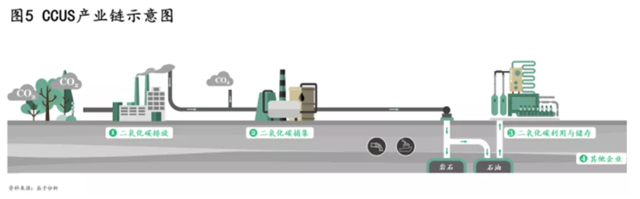 CCUS(碳捕集利用與封存技術),被認為是最具潛力的前沿減排技術之一(見圖5)。聯(lián)合國政府間氣候變化專門委員會(IPCC)第五次評估報告指出:如果沒有CCUS,絕大多數(shù)氣候模式都不能實現(xiàn)減排目標。更為關鍵的是,沒有CCUS技術,減排成本將會成倍增加,估計增幅平均高達138%。
