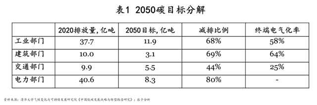 將30·60目標按部門進行分解可以看到,到2050年工業(yè)部門需減排68%、終端電氣化率58%,建筑部門減排69%、終端電氣化率64%,交通部門減排44%、終端電氣化率25%,而電力部門則需減排80%以上,任務艱巨(見表1)。