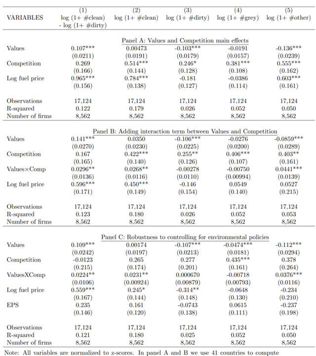 第一,本文構(gòu)建了一個(gè)簡單的模型,并收集了企業(yè)級汽車行業(yè)、國民環(huán)境態(tài)度(綠色偏好)和市場競爭程度的數(shù)據(jù)。我們發(fā)現(xiàn):綠色偏好及其與市場競爭的相互作用都對企業(yè)重視綠色創(chuàng)新的機(jī)率有顯著的積極影響。
