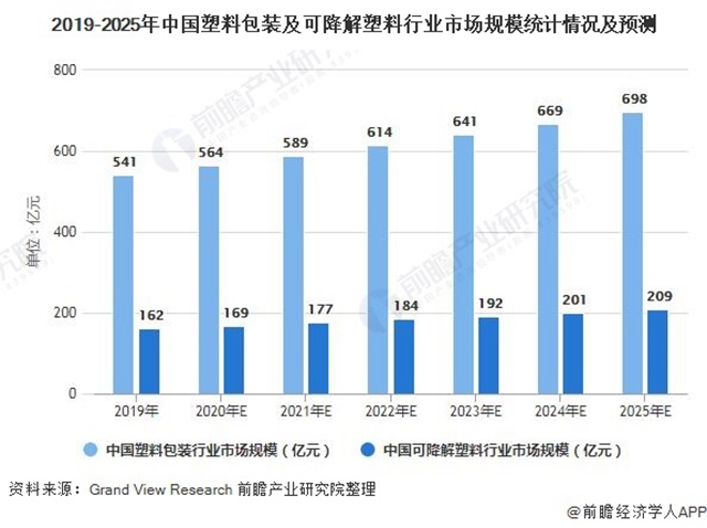 我國是全球塑料消費大國,塑料消費量占全球的比重達15%,根據(jù)Grand View Research公布的數(shù)據(jù)顯示,2019年我國塑料包裝市場規(guī)模541億美元,預計到2025年我國塑料包裝市場規(guī)模將達到698億美元,按照可降解塑料替換率為30%計算,預計2025年我國可降解塑料市場規(guī)模約為209億美元,總體看來,我國可降解塑料市場前景廣闊,行業(yè)發(fā)展可期。