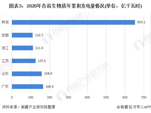 2020年,我國(guó)生物質(zhì)年發(fā)電量排名前五位的省份是廣東、山東、江蘇、浙江和安徽,分別為166.4億千瓦時(shí)、158.9億千瓦時(shí)、125.5億千瓦時(shí)和110.7億千瓦時(shí)。