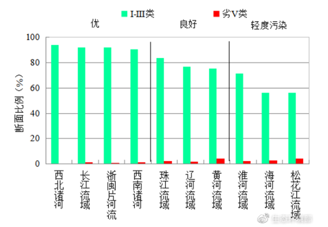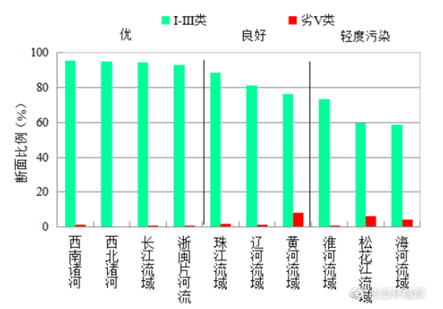 1-4月,長江、黃河、珠江、松花江、淮河、海河、遼河等七大流域及西北諸河、西南諸河和浙閩片河流水質(zhì)優(yōu)良(Ⅰ——Ⅲ類)斷面比例為83.8%,同比上升1.5個百分點;劣Ⅴ類斷面比例為2.1%,同比下降1.1個百分點。主要污染指標(biāo)為化學(xué)需氧量、高錳酸鹽指數(shù)和五日生化需氧量。其中,西南諸河、西北諸河、長江流域和浙閩片河流水質(zhì)為優(yōu),珠江、遼河和黃河流域水質(zhì)良好,淮河、松花江和海河流域為輕度污染。