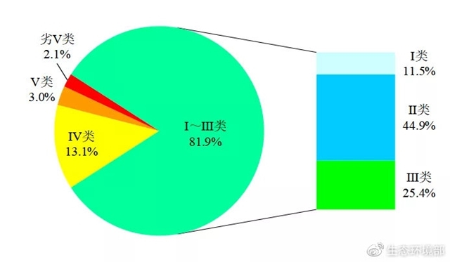 1-4月,3641個國家地表水考核斷面中,水質(zhì)優(yōu)良(Ⅰ——Ⅲ類)斷面比例為81.9%,同比上升1.0個百分點;劣Ⅴ類斷面比例為2.1%,同比下降0.9個百分點。主要污染指標(biāo)為化學(xué)需氧量、高錳酸鹽指數(shù)和總磷。