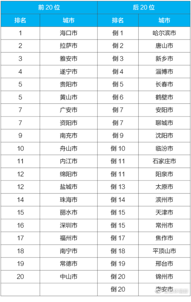 4月,168個重點城市中,哈爾濱、唐山和新鄉(xiāng)市等城市空氣質(zhì)量相對較差(從倒數(shù)第1名至并列倒數(shù)第20名);??凇⒗_和雅安市等城市空氣質(zhì)量相對較好(從第1名至第20名),見附表3。