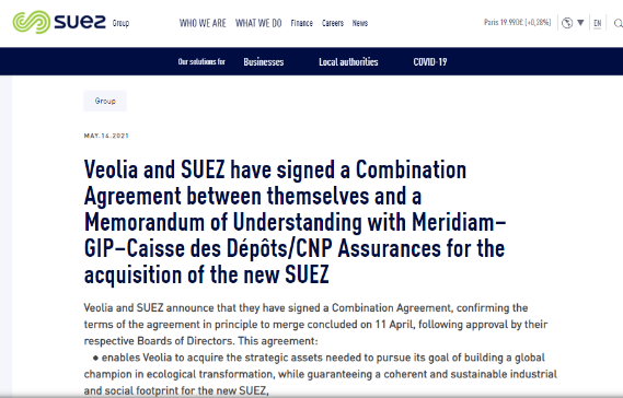 2020年8月30日,威立雅提出以29億歐元的價格從法國天然氣和電力公司Engie手中收購其競爭對手蘇伊士集團(tuán)29.9%的股份,以創(chuàng)建一個“生態(tài)改造的世界冠軍”。