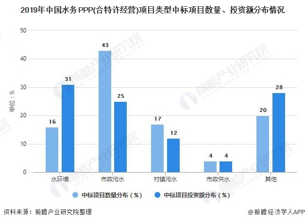 2019年,水務PPP(合特許經營)中標項目數量超過400個,投資額近3000億。從項目數量分布上看,市政污水處理特許經營占主要部分,占比43%;從項目金額分布上看,水環(huán)境PPP占比最大,占比31%。