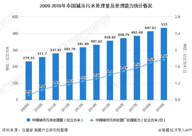 污水處理是目前水務行業(yè)重點關注的領域之一。由于城鎮(zhèn)化和經濟發(fā)展需求,中國城市近年來污水產生量和處理量呈上升趨勢。從城市污水處理情況來看,截至2019年底,全國城市污水處理廠處理能力1.77億立方米/日,累計處理污水量523億立方米;全國地級及以上城市建成區(qū)排查出黑臭水體2899個,其中2513個經過處理已消除黑臭現象,消除比例達86.7%。