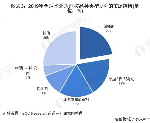 從2019年全球水處理劑按試劑類型劃分的產(chǎn)品結(jié)構(gòu)來(lái)看,消費(fèi)額最大的是緩蝕劑,消費(fèi)占比為22%;其次是混凝劑和絮凝劑,占比位居第二,為19%;第三位則是殺菌劑和消毒劑,占比為17%。