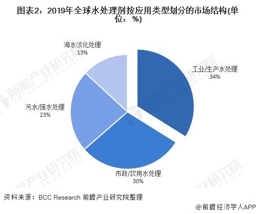 根據(jù)BCC Research數(shù)據(jù)統(tǒng)計(jì),2019年全球水處理按應(yīng)用類別劃分的市場(chǎng)結(jié)構(gòu)中,應(yīng)用在工業(yè)生產(chǎn)水處理消耗的水處理劑最多,占到2019年全球水處理劑市場(chǎng)總額的34%;其次是市政及飲用水處理,這一領(lǐng)域的水處理劑市場(chǎng)規(guī)模占比為30%;然后在污水和廢水處理板塊,水處理劑市場(chǎng)規(guī)模為23%;最后在海水淡化領(lǐng)域,市場(chǎng)份額占比為13%。