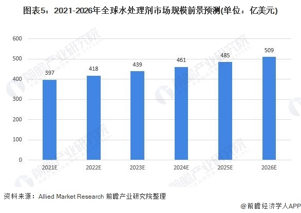 根據(jù)Allied Market Research的估計(jì),預(yù)計(jì)2021年至2030年復(fù)合年增長(zhǎng)率(CAGR)為5.1%,即到2026年全球水處理劑市場(chǎng)規(guī)模會(huì)到509億美元。