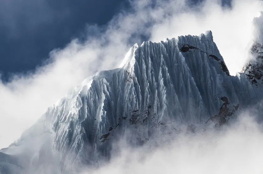 白雪皚皚的山峰在云層中若隱若現(xiàn)