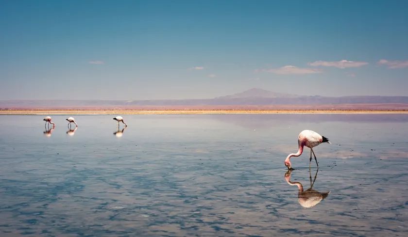 火烈鳥(niǎo)佇立在智利湖中。