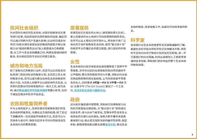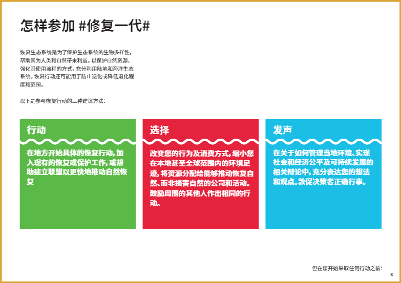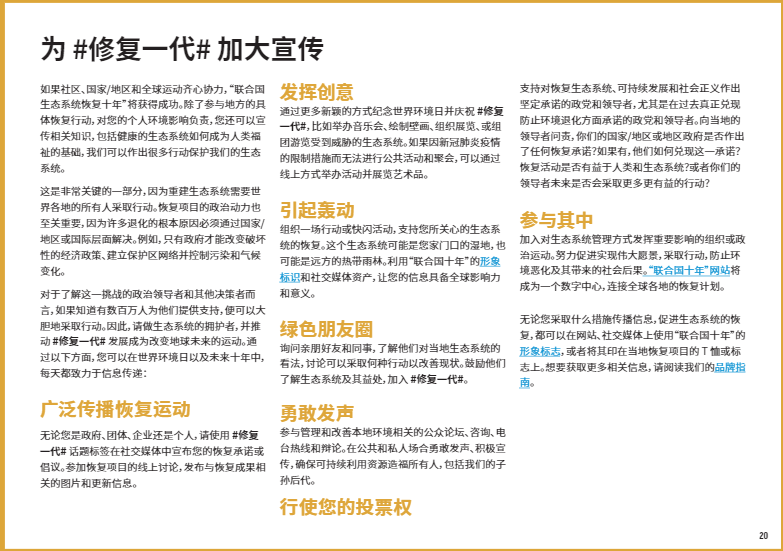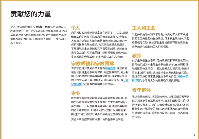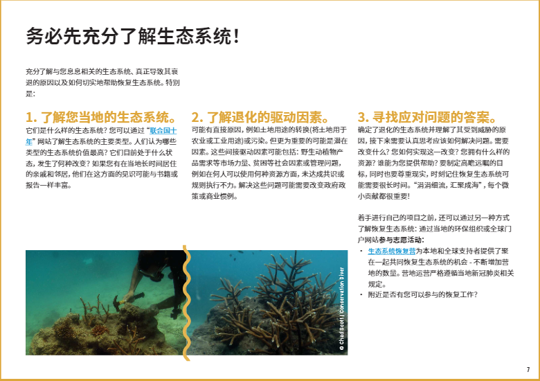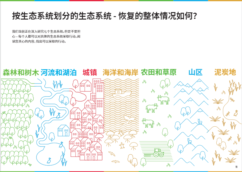 在本文中,我們將重點(diǎn)介紹八個(gè)關(guān)鍵的生態(tài)系統(tǒng)類型,以及如何開(kāi)展修復(fù)工作使它們恢復(fù)活力。如果你有志于加入#修復(fù)一代,#RestorationGeneration,想深入了解改善本地生態(tài)系統(tǒng)的方法,歡迎大家下載閱讀由”聯(lián)合國(guó)十年”倡議發(fā)布的《生態(tài)系統(tǒng)修復(fù)手冊(cè)》,一本有關(guān)治愈地球的實(shí)用指南??