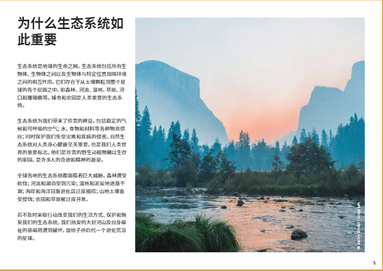 大至森林,小至池塘,都是生態(tài)系統(tǒng)。各式各樣的生態(tài)系統(tǒng)對(duì)人類社會(huì)至關(guān)重要,它們不僅為我們提供了水、食物、建筑材料和許多其他必需品,還有利于整個(gè)地球的利益和福祉,比如提供氣候保護(hù)和生物多樣性保護(hù)。