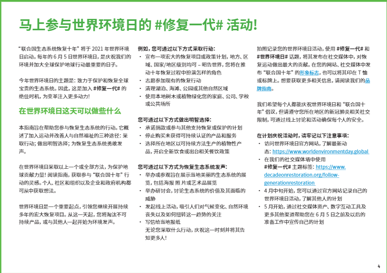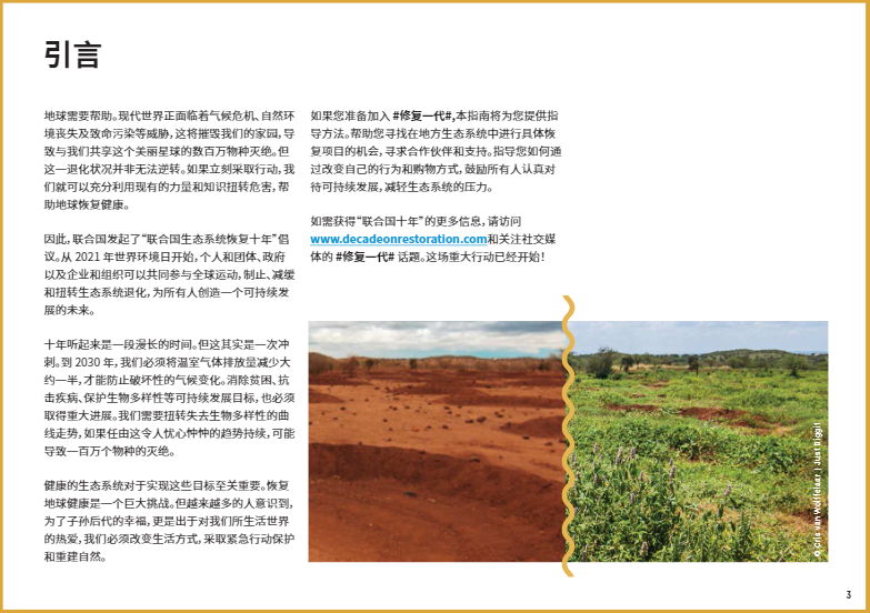 今年6月5日世界環(huán)境日將正式啟動(dòng) “聯(lián)合國(guó)生態(tài)系統(tǒng)恢復(fù)十年”倡議。這是一項(xiàng)長(zhǎng)達(dá)十年的倡議,旨在調(diào)動(dòng)全球力量,共同制止并扭轉(zhuǎn)自然世界的衰退。在過(guò)去的幾個(gè)月中,有個(gè)詞頻繁地被科學(xué)家、政府官員和環(huán)境活動(dòng)家提及:生態(tài)系統(tǒng)修復(fù)。今年6月5日世界環(huán)境日將正式啟動(dòng) “聯(lián)合國(guó)生態(tài)系統(tǒng)恢復(fù)十年”倡議。這是一項(xiàng)長(zhǎng)達(dá)十年的倡議,旨在調(diào)動(dòng)全球力量,共同制止并扭轉(zhuǎn)自然世界的衰退。