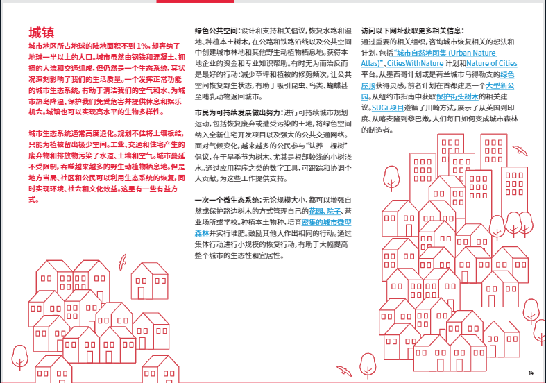 城鎮(zhèn)看起來(lái)就像是生態(tài)沙漠。房屋、道路和工廠之間幾乎沒(méi)有植被生長(zhǎng)的空間。廢棄物和污染破壞水道、土壤和空氣。但是城市具有巨大的恢復(fù)潛力。公民團(tuán)體和市政當(dāng)局可以清理水道;種植吸引蜜蜂的植物;并在公園、學(xué)校和其他公共場(chǎng)所創(chuàng)造城市林地和其他野生動(dòng)植物棲息地。減少割草的頻率不僅能節(jié)約城市的開(kāi)支,并且可以使自然蓬勃發(fā)展。透水性人行道以及城市濕地可防止洪水和污染。改造受污染的工業(yè)區(qū),使之變身成為自然和娛樂(lè)場(chǎng)所。你知道嗎? 如今在紐約的中央公園,載有記錄的鳥(niǎo)類高達(dá)280多種。在聯(lián)合國(guó)環(huán)境規(guī)劃署和聯(lián)合國(guó)糧食及農(nóng)業(yè)組織的領(lǐng)導(dǎo)下,“聯(lián)合國(guó)生態(tài)系統(tǒng)恢復(fù)十年”倡議將匯集全球的政治支持、科學(xué)研究和財(cái)政力量,開(kāi)展大規(guī)模的生態(tài)修復(fù)工作,致力于恢復(fù)數(shù)百萬(wàn)公頃的陸地和水生生態(tài)系統(tǒng)。