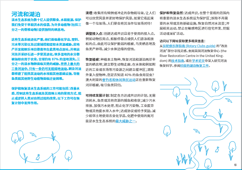安全且充足的水源已成為一種奢侈品。污染、過(guò)度捕撈、基礎(chǔ)設(shè)施建設(shè)以及因灌溉、工業(yè)和家庭用水增加而對(duì)水資源無(wú)休止的攫取正導(dǎo)致淡水生態(tài)系統(tǒng)不斷退化?;謴?fù)意味著減輕污染、減少并有效處理廢棄物、對(duì)水源和魚(yú)類資源的開(kāi)采進(jìn)行可持續(xù)管理以及恢復(fù)地表和地下的植被。