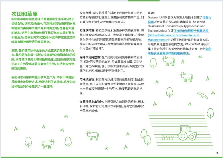 對(duì)土地的過(guò)度墾殖以及不合理的耕作利用、水土流失、過(guò)量使用化肥和農(nóng)藥正在耗盡農(nóng)田中土壤的活力。恢復(fù)農(nóng)田的方法包括減少耕種,更多地使用天然肥料和病蟲(chóng)害防治方法以及種植包括樹(shù)木在內(nèi)的多種農(nóng)作物。這些行動(dòng)有助于重建土壤中的碳儲(chǔ)量,使其更加肥沃,確保各國(guó)在不占用更多耕地面積的情況下養(yǎng)活不斷增長(zhǎng)的人口。農(nóng)田的恢復(fù)還為野生動(dòng)植物創(chuàng)造了棲息地。