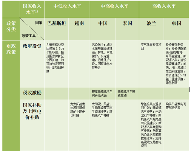 總結(jié)而言,中等偏下收入的國(guó)家更多地依賴(lài)生態(tài)環(huán)保相關(guān)項(xiàng)目來(lái)帶動(dòng)就業(yè)。而中等偏上收入和高收入國(guó)家將財(cái)政政策輻射到更多領(lǐng)域(如新能源汽車(chē)、建筑節(jié)能、能效)且利用了更豐富的政策工具(如財(cái)政政策上的稅收優(yōu)惠、補(bǔ)貼,配套的貨幣政策等)。