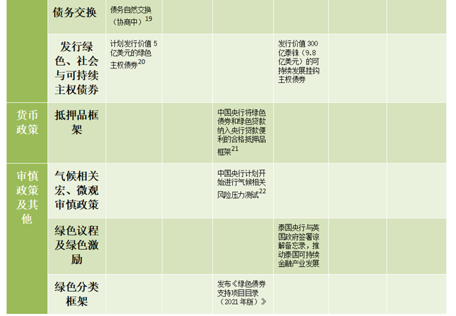 兩個(gè)中等偏上收入的國(guó)家,在生態(tài)基礎(chǔ)設(shè)施和污染治理的基礎(chǔ)上,將財(cái)政刺激更多地傾斜于可再生能源發(fā)展和新能源車(chē)補(bǔ)貼。對(duì)新能源汽車(chē)行業(yè)的支持同時(shí)也包括了在購(gòu)買(mǎi)、生產(chǎn)和投資方面的稅收優(yōu)惠。在貨幣政策和金融監(jiān)管方面,中國(guó)央行將綠色債券和綠色貸款納入央行貸款便利的合格抵押品框架,計(jì)劃開(kāi)始進(jìn)行氣候風(fēng)險(xiǎn)壓力測(cè)試,同時(shí)發(fā)布了《綠色債券支持項(xiàng)目目錄(2021年版)》對(duì)綠色債券市場(chǎng)進(jìn)行了進(jìn)一步規(guī)范和指導(dǎo)。